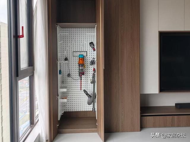 装好以后,你会发现家里所有的清洁工具,包括吸尘器,甚至配件,通通都能悬挂在洞洞板上。