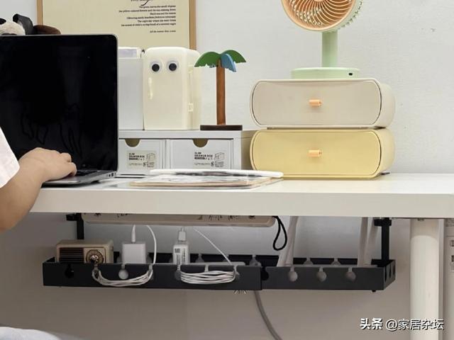 将插排放入盒子内,盒子的侧方留有出线口。这样我家里所有设备的电源线,再用理线器例如魔术贴或者卡扣式的,沿着桌腿和柜体背面固定,就能做到横平竖直。